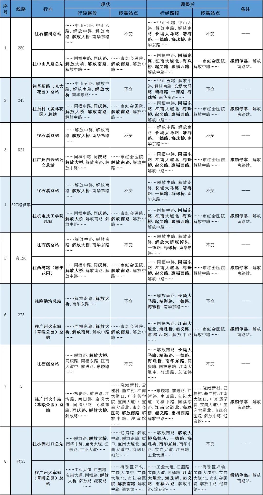 1.临时调整公共汽车B8、5、113、191、243、244、244A、250、273、527、527路机电技师学院班车、夜36、夜55、夜89、夜120等线路从海珠桥绕行后接回原线运营。
