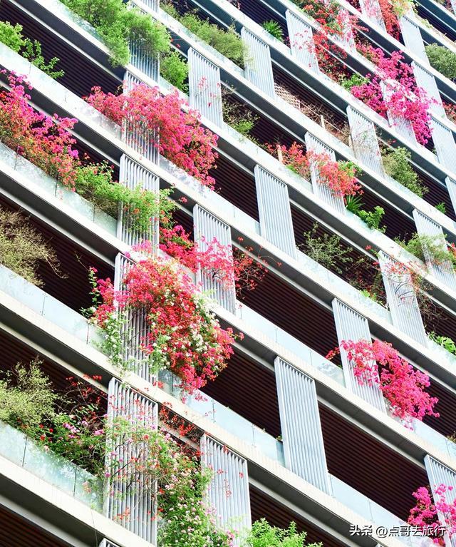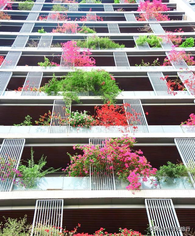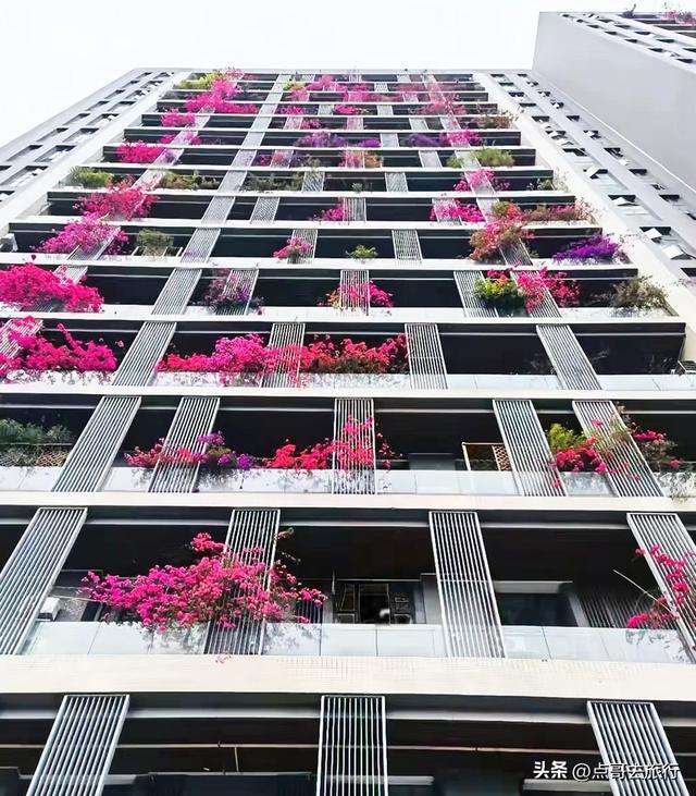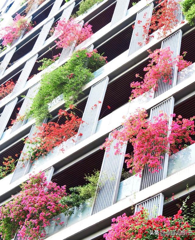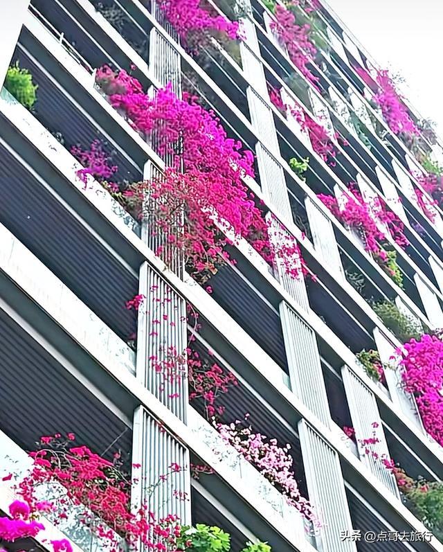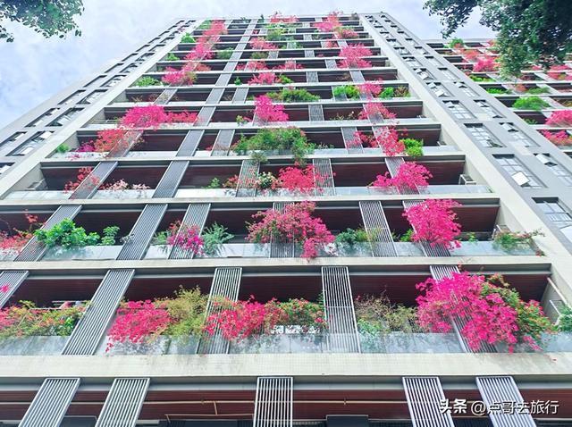 这里可火了,从2020年登上人民日报后,就迅速出圈了,被网友誉为 “成都最美空中花墙”“三角梅大楼”。这里不是普通的墙面绿化,而是一栋32层高楼外立面完全被紫红色三角梅覆盖,形成罕见的“空中花瀑”。今年三角梅长势比往年更猛,首次实现了从顶楼到底楼“户户见花”。三角梅沿每层公共走廊外沿种植,每层8户,总计240户人家,从1楼到32层无缝衔接,花藤垂落最长达3-5米,形成近百米高、宽约 50 米的立体花墙。
