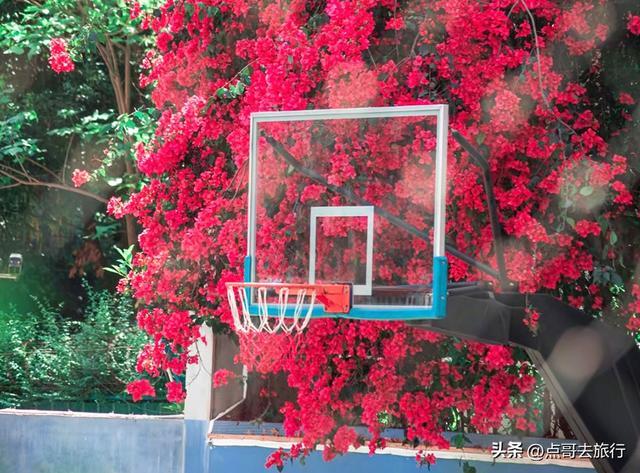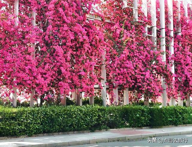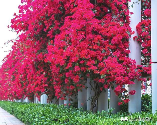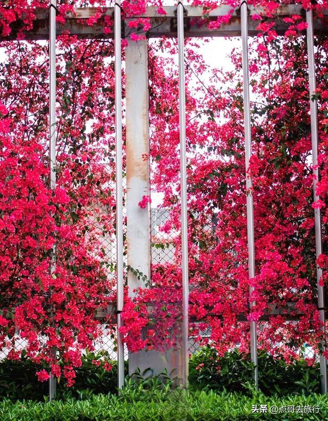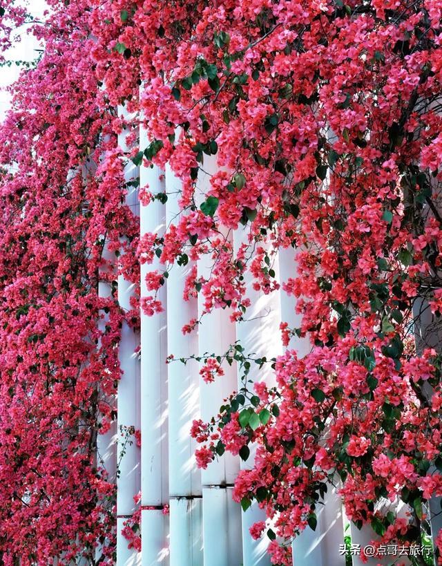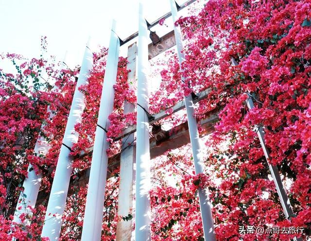 不同于公园的精致,这里特殊的校园背景。紫红色的三角梅与校园围墙、白色围栏相映成趣,书香和花香交织,青春与繁花相映,这种特殊的景致在成都不多见。花团层层叠叠,搭配白色围栏与蓝天,几何美感十足。墙边还设有固定的铁楼梯,无需垫脚即可近距离接触花朵,拍照毫无压力。